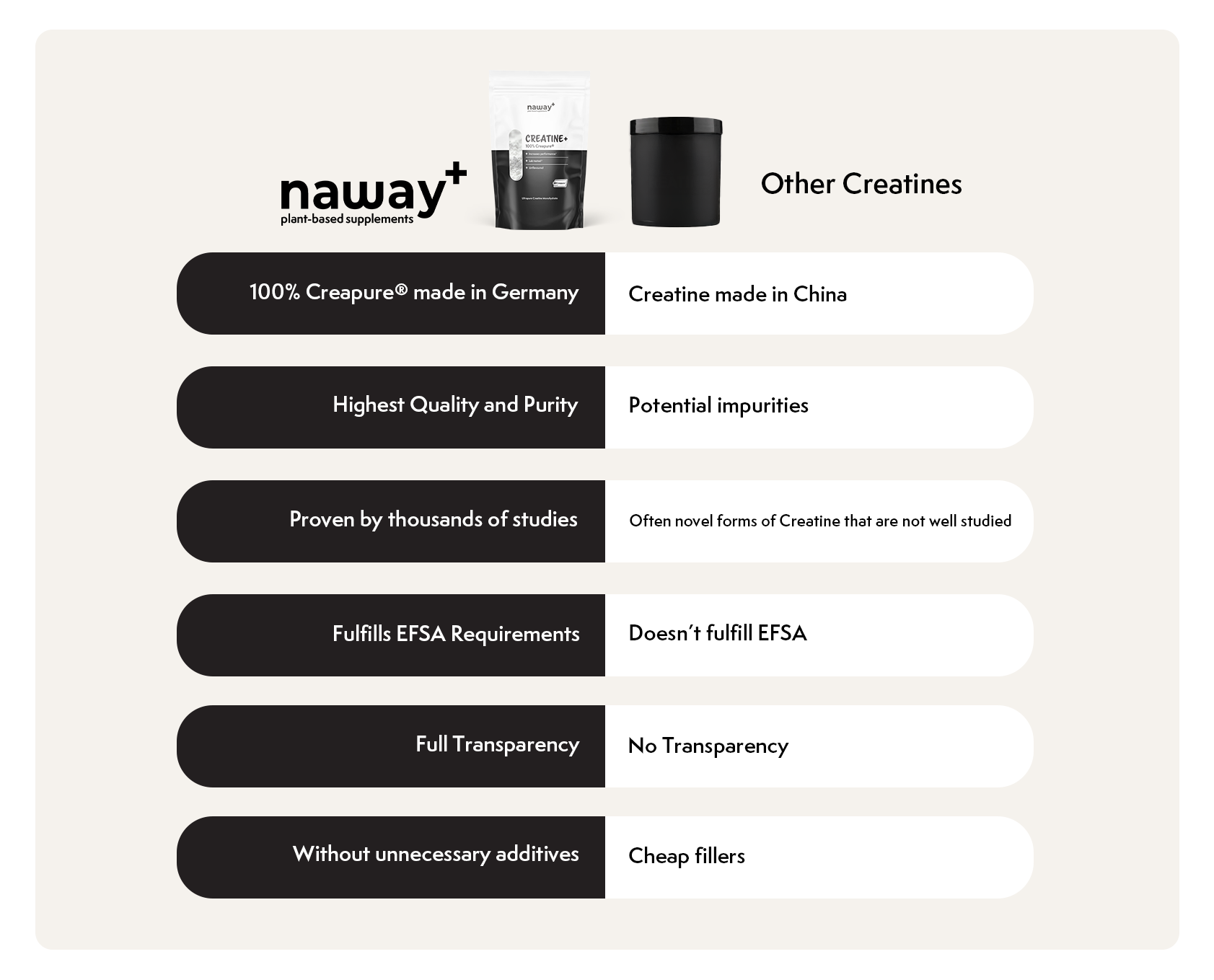 It’s the only creatine made in the Western world – entirely produced in a certified facility in Germany that follows strict EU food safety standards (FSSC 22000, ISO 9001, etc.).